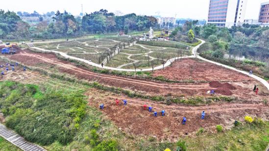 施工现场,数十名园林工人有序开展土地清理、场地平整及地形堆造作业,同步清理效果欠佳的绿植,总面积约6000平方米。