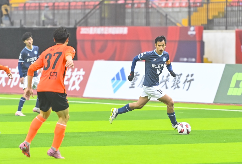 ▲两江临空队(蓝)本周六将迎战大渡口队。图为12月20日,两江临空队主场0:0战平北碚队。记者 齐岚森 摄