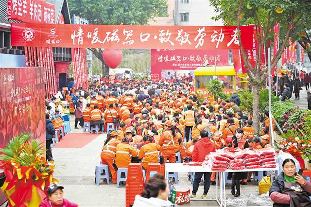12月19日,由知名公益人张世文发起的“渝味暖心·坝坝宴”在千年古镇磁器口开宴,上千名环卫工欢聚一堂,品尝羊肉汤锅、荣昌卤鹅等重庆美食,还收到了暖心大礼包。