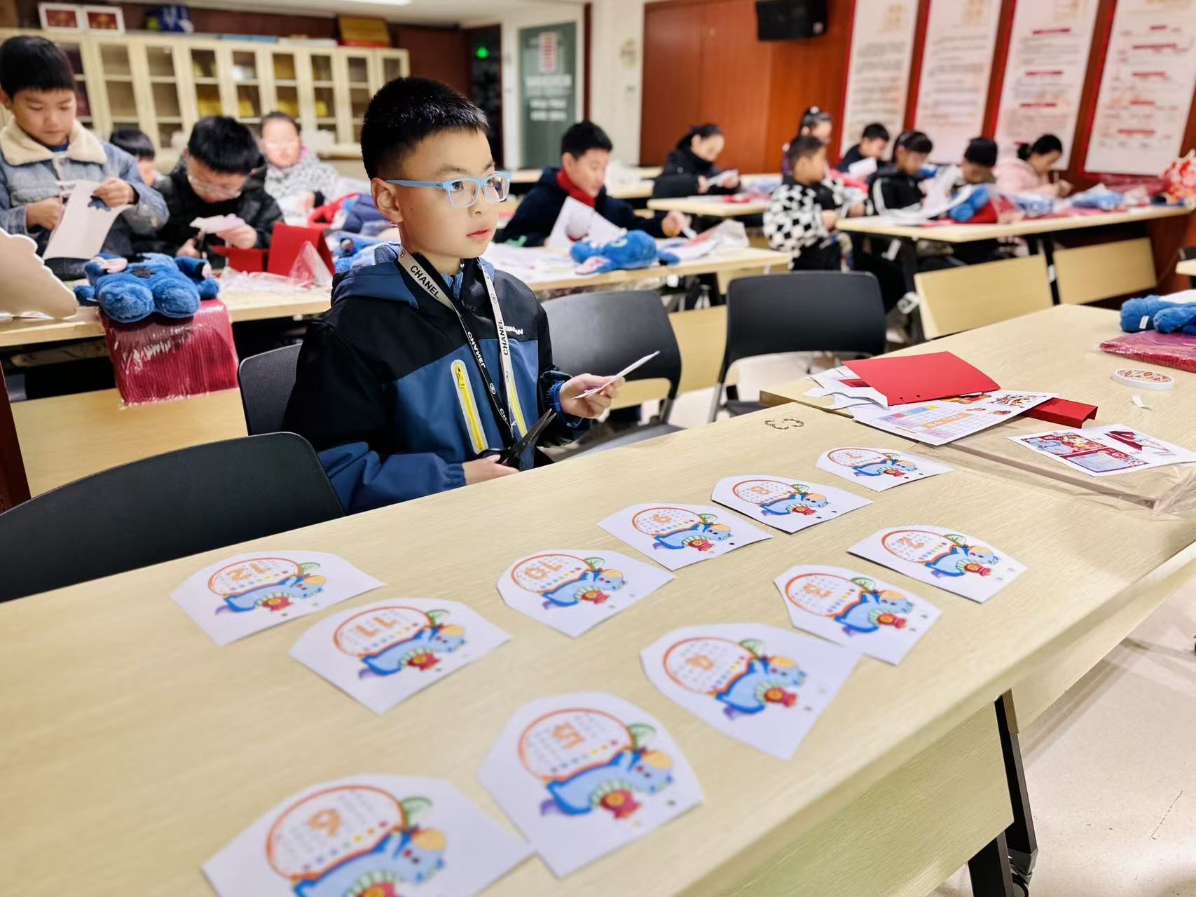 在温馨愉快的“新年日历DIY”手工环节中,孩子们分组协作,共同设计、绘制并装饰新年日历。过程中大家充分沟通、互帮互助,展现出良好的团队合作精神。作品完成后,各组轮流展示作品并分享创作思路,现场洋溢着成就感和集体温暖。