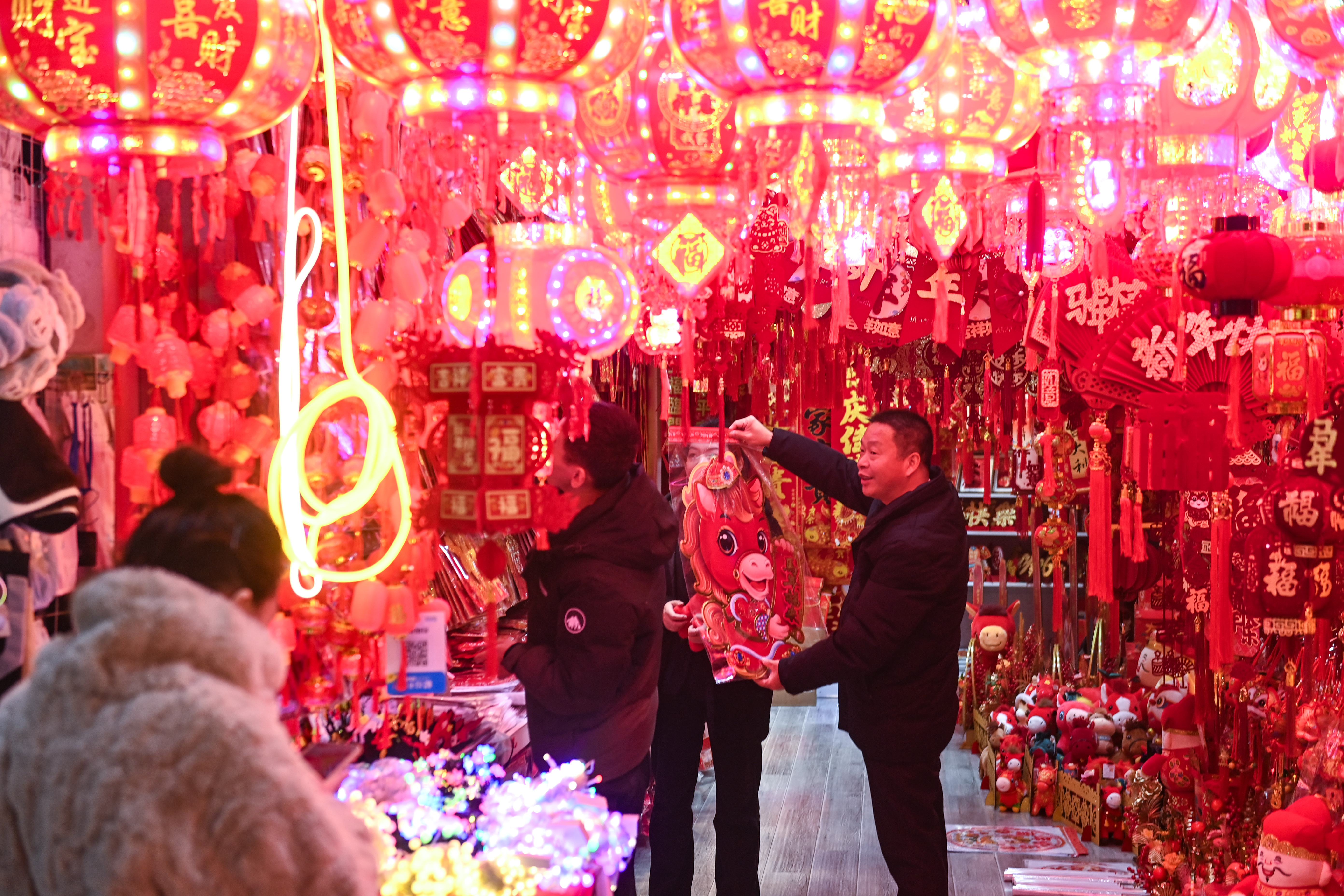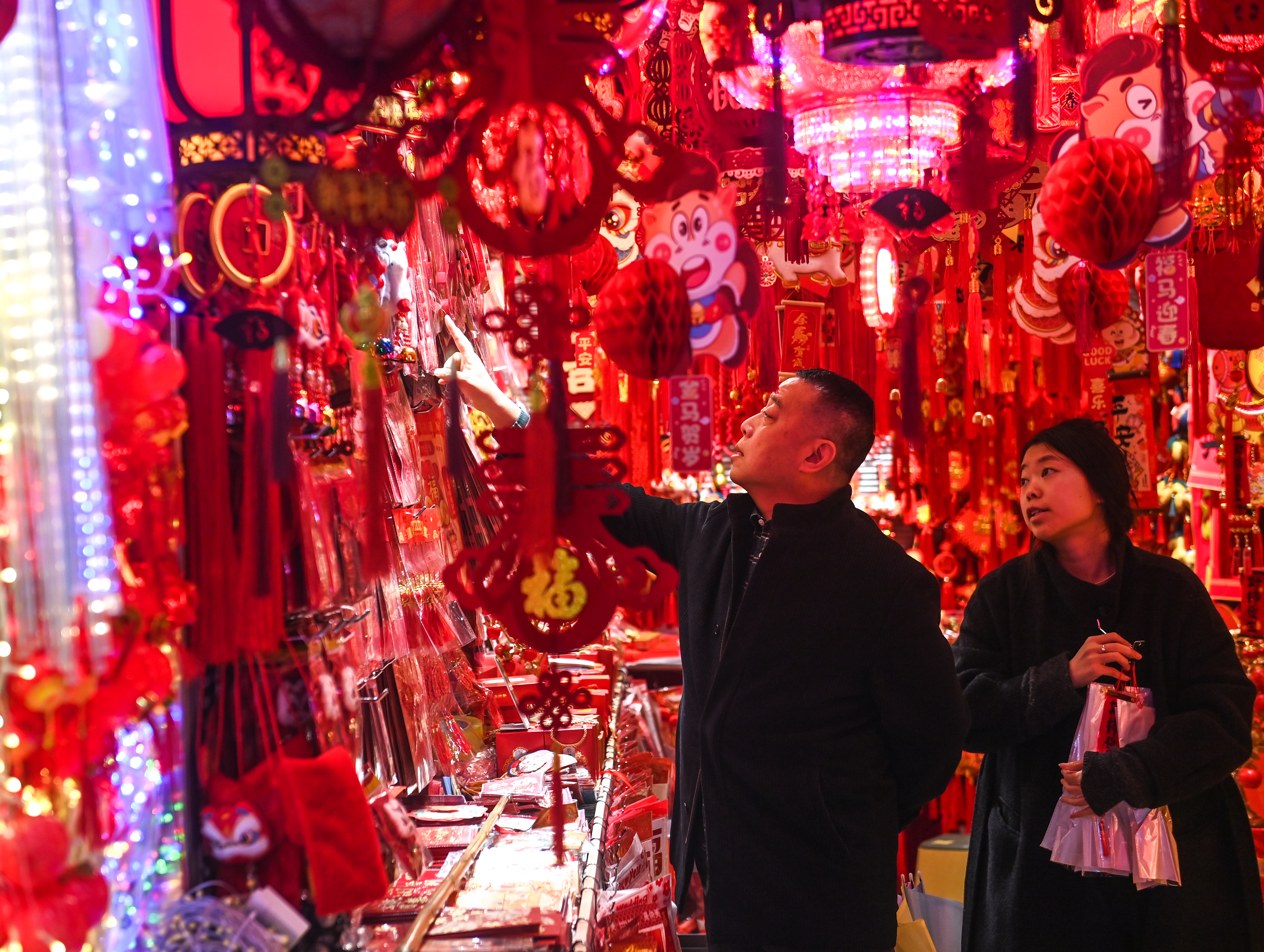 新年将近,各地商家和消费者开始筹备新年装饰品,各式各样的年货饰品琳琅满目,众多市民前来挑选购买,为迎接新年增添浓厚的节日氛围。