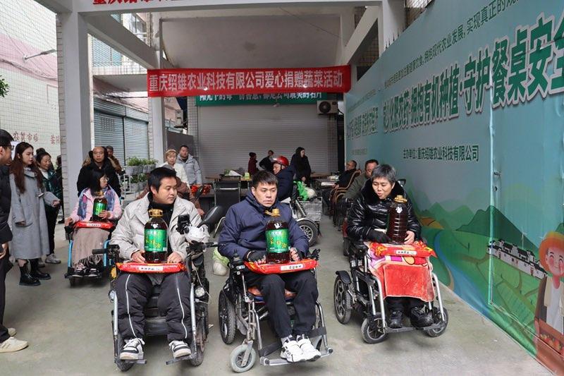 在丰都县三合街道南天湖西路社区的爱心捐赠蔬菜活动现场,贫困户家庭、残疾人朋友以及一些老年群体分别收到米、油以及两家公司自己种植生产的蔬菜捐赠,