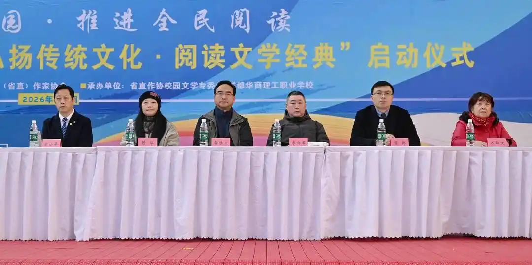 1月6日下午,由四川省红星(省直)作家协会主办,省直作协校园文学专委会与成都华商理工职业学校承办的“弘扬传统文化 阅读文学经典”启动仪式,在成都华商理工职业学校隆重举行。此次活动以《全民阅读促进条例》施行为契机,标志着“省直作家进校园”活动将全面走深走实,全省范围内 “采风创作基地校”和“书香校园示范校”的遴选建设工作也正式拉开序幕。