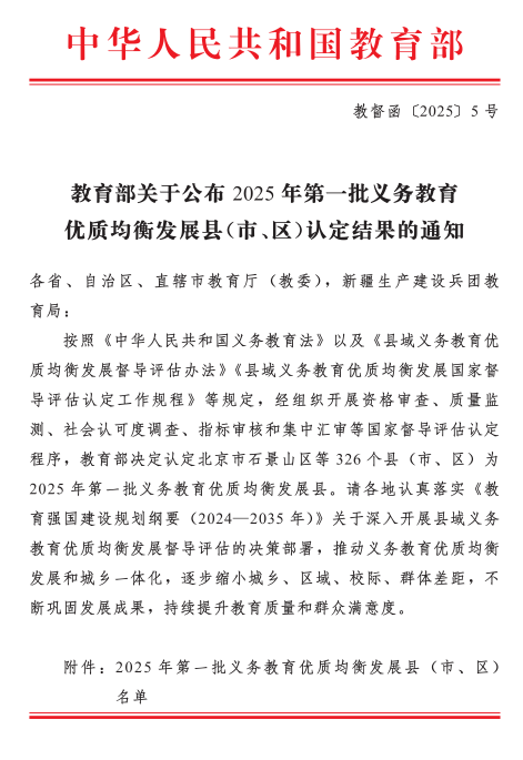 近日,教育部印发《关于公布2025年第一批义务教育优质均衡发展县(市、区)认定结果的通知》,公布2025年第一批义务教育优质均衡发展县(市、区)名单,大渡口区圆满通过国家督导评估认定,跨入“全国义务教育优质均衡发展区”行列!