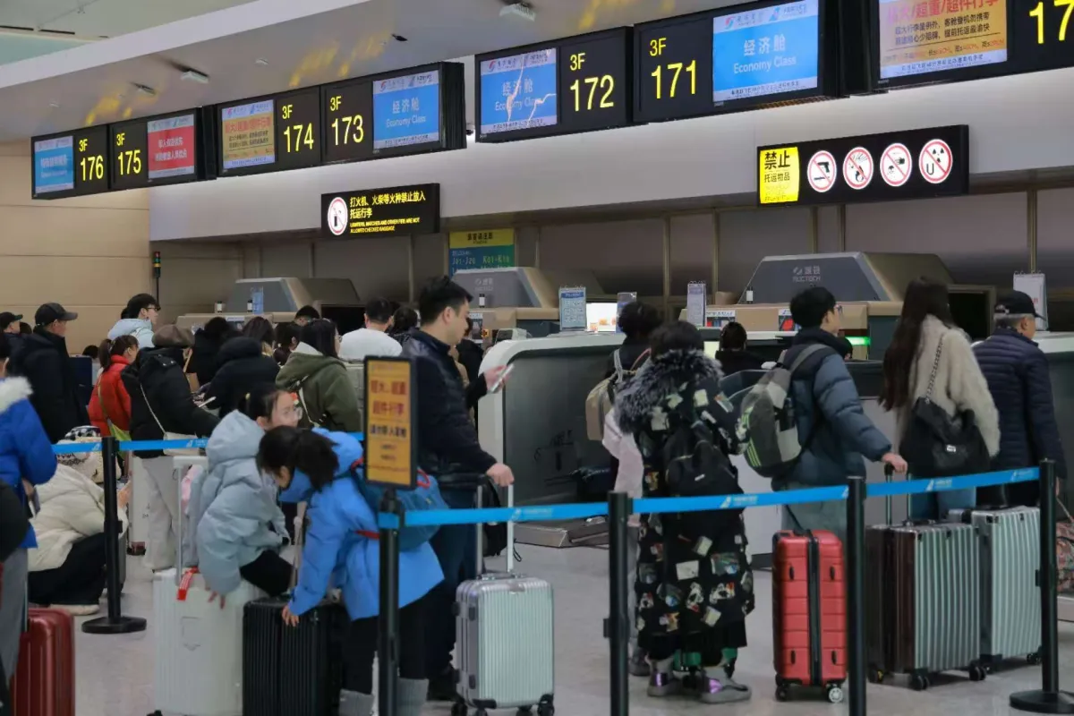 Travelers wait to check in at an airport service counter. (Photo/China Daily)