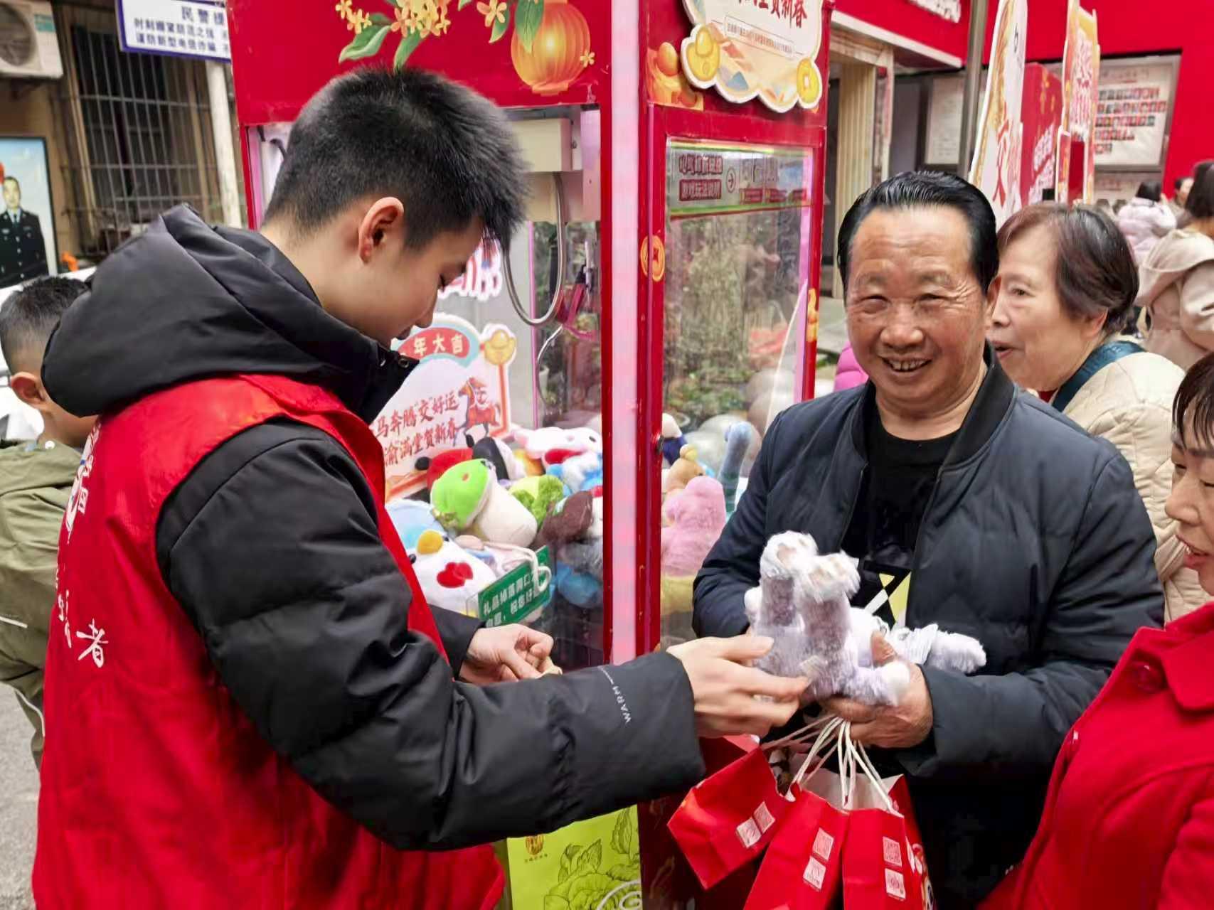 活动期间,双会场同步开启八大趣味游园项目,搭配多轮幸运抽奖,吸引居民踊跃参与、乐在其中,现场欢声笑语不断、氛围热烈有序。从趣味互动到便民服务,从物资慰问到邻里相聚,每一处细节都彰显着社区合伙人机制的强大合力,也让“碚家·幸福”的品牌内涵更加鲜活,让辖区群众在热闹的烟火气中,切实感受到新春暖意与民生温度。